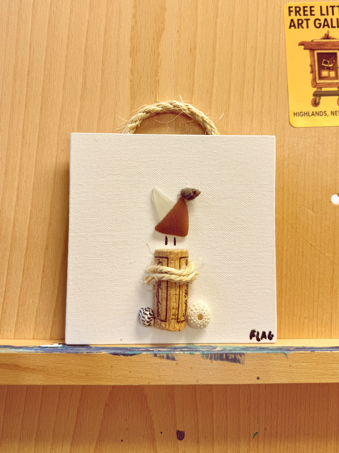 Medium: Wine cork, sea glass shards, twine, shell fragments, sea urchin test, mounted on canvas