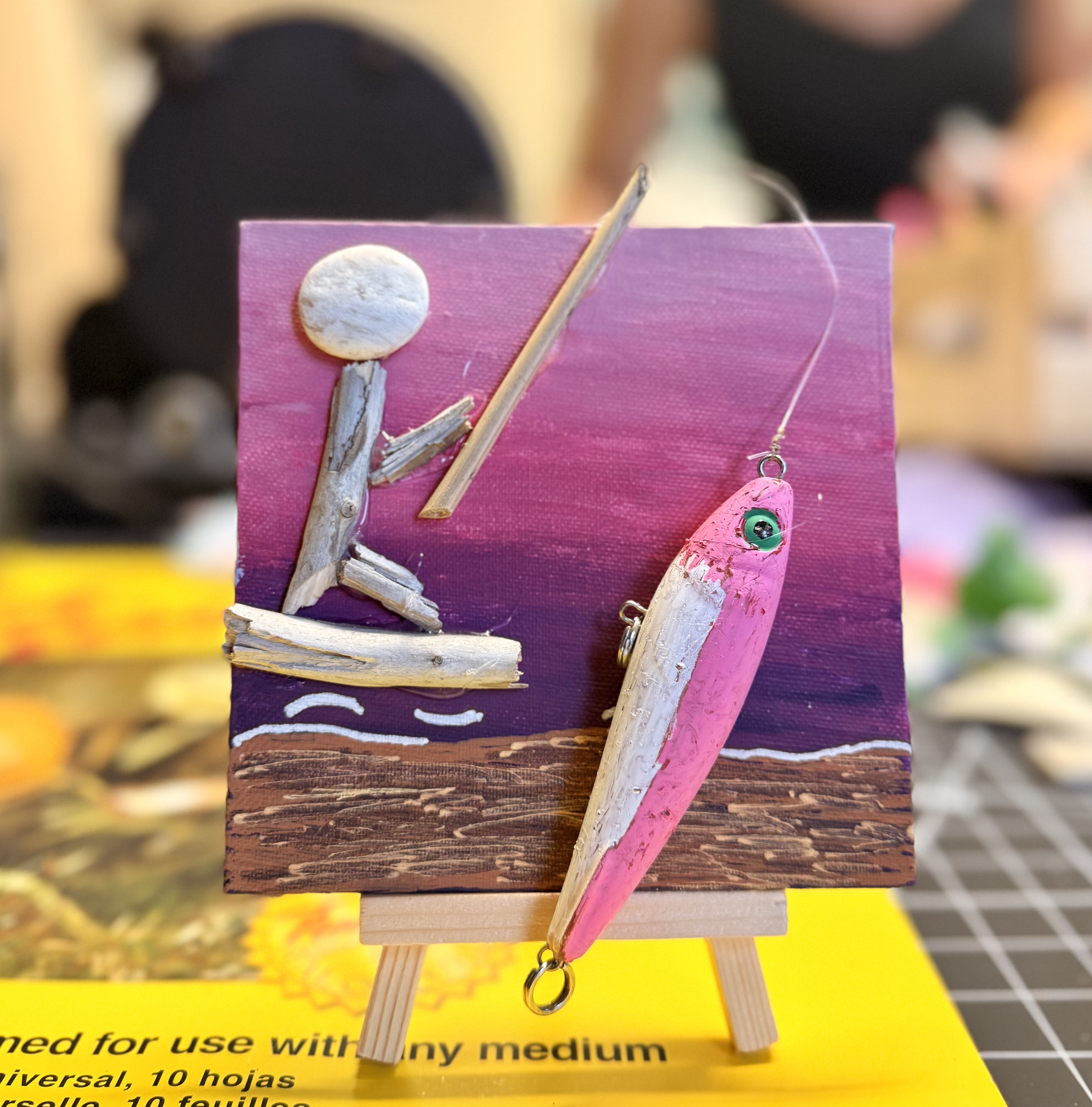 This piece was created at Camp Freedom using found driftwood from the Jersey Shore and a salvaged lure. It celebrates quiet moments, patience, and the feeling of being one cast away from magic.