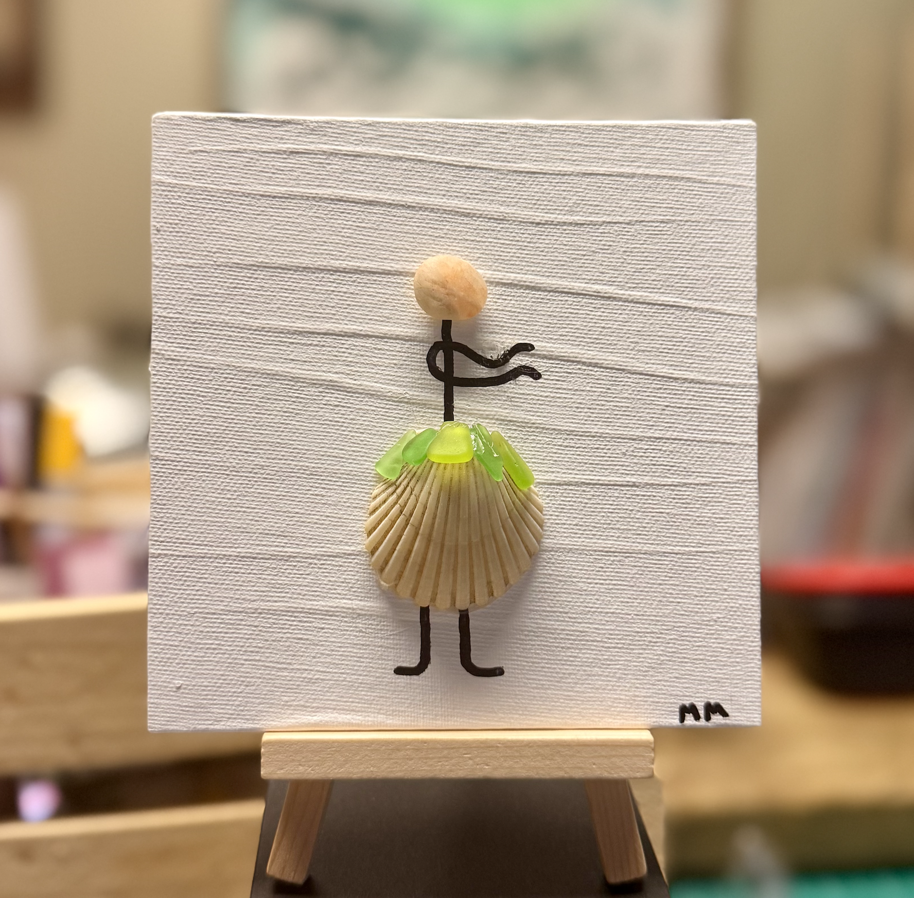 Poised mid-twirl, this joyful island dancer is composed of a soft beach pebble for the head, a shell skirt fanned like a sunbeam, and a crown of sea glass that forms a vibrant green lei. Her limbs and movement are suggested by simple, playful black linework—arms swaying, feet ready to step to a rhythm only she hears.