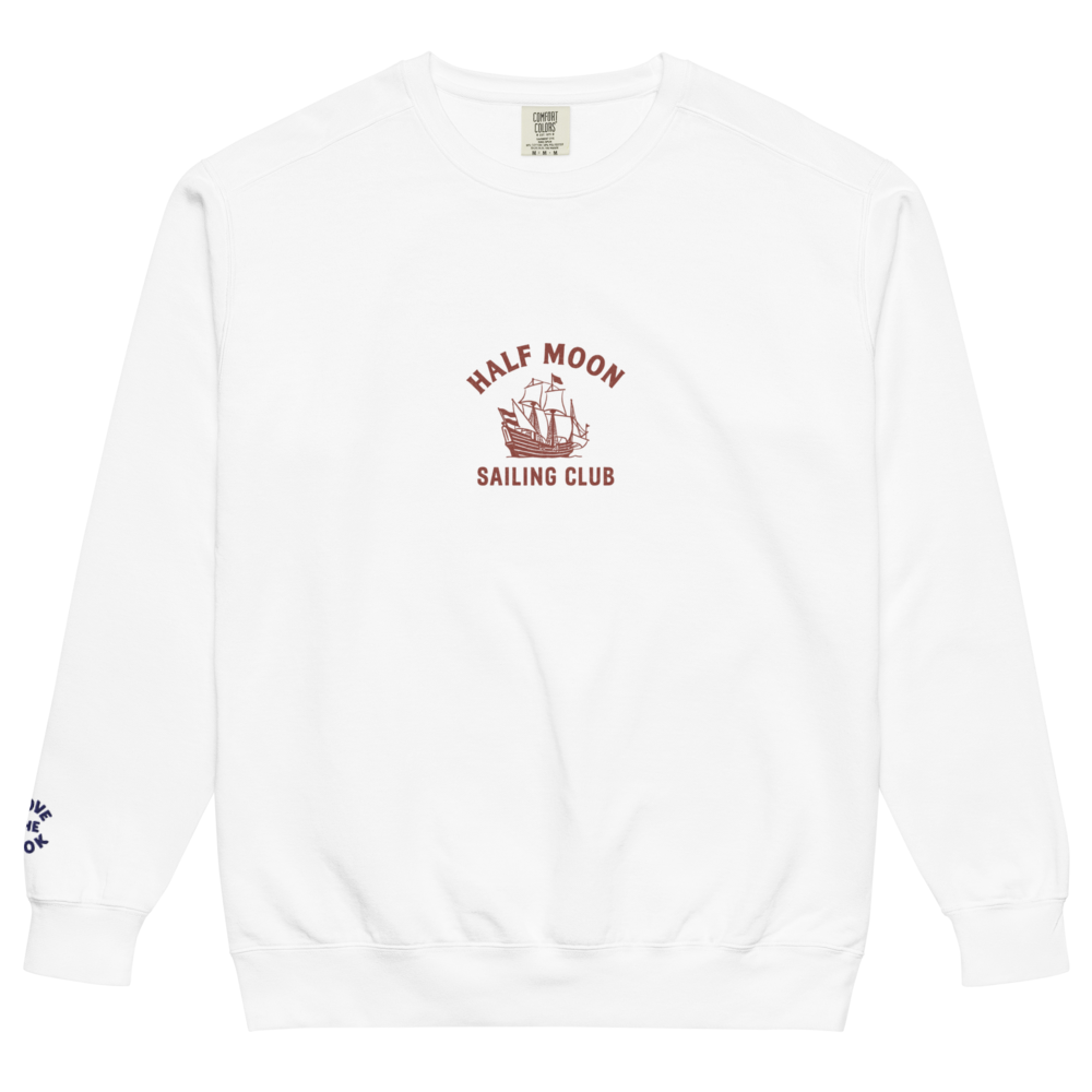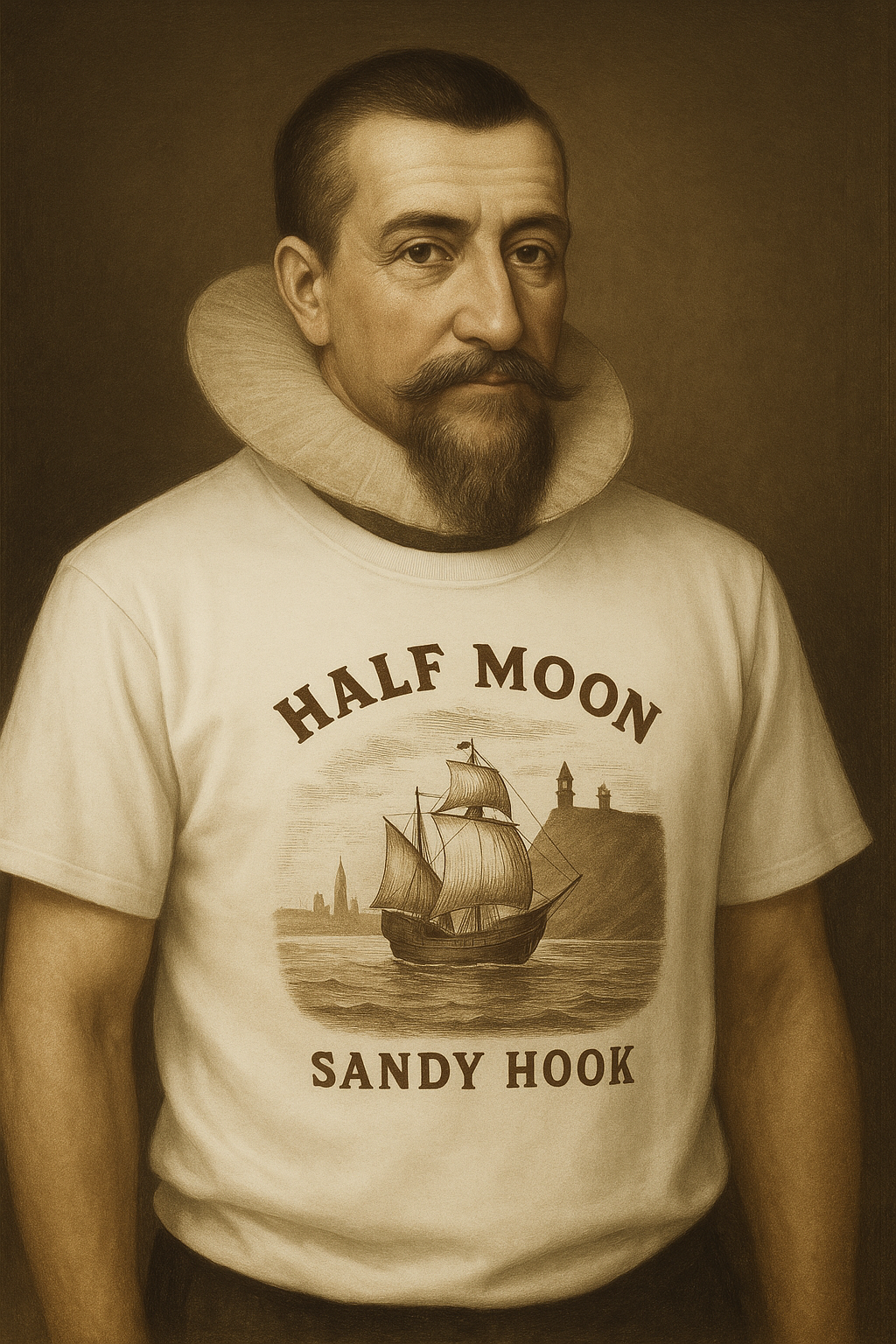 This design reimagines a historic image of the Half Moon sailing into New York Harbor, framed by the Highlands’ iconic Twin Lights and the emerging skyline of New York City in the distance. It’s a visual bridge across centuries—linking the earliest explorations of the Hudson River to the enduring presence of Sandy Hook and Highlands as a maritime gateway.